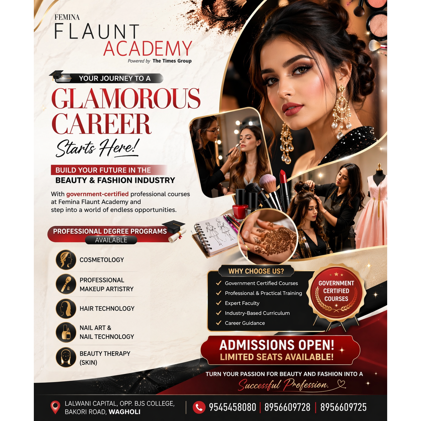 #FeminaFlauntAcademy #BeautyCareer #MakeupArtist #Cosmetology #NailArt #HairStylist #Wagholi #Pune #CareerGrowth #SkillDevelopment #AdmissionsOpen